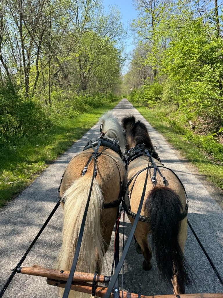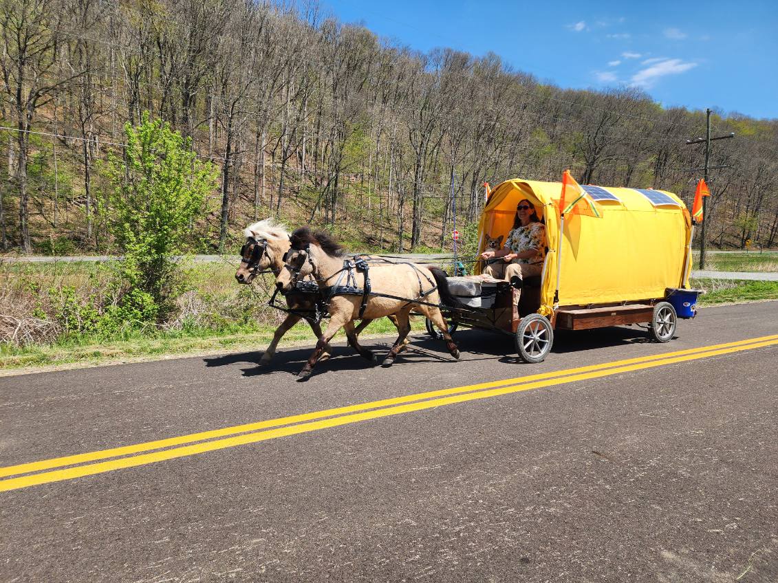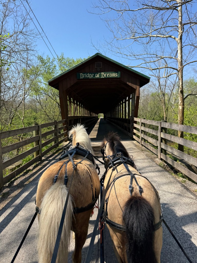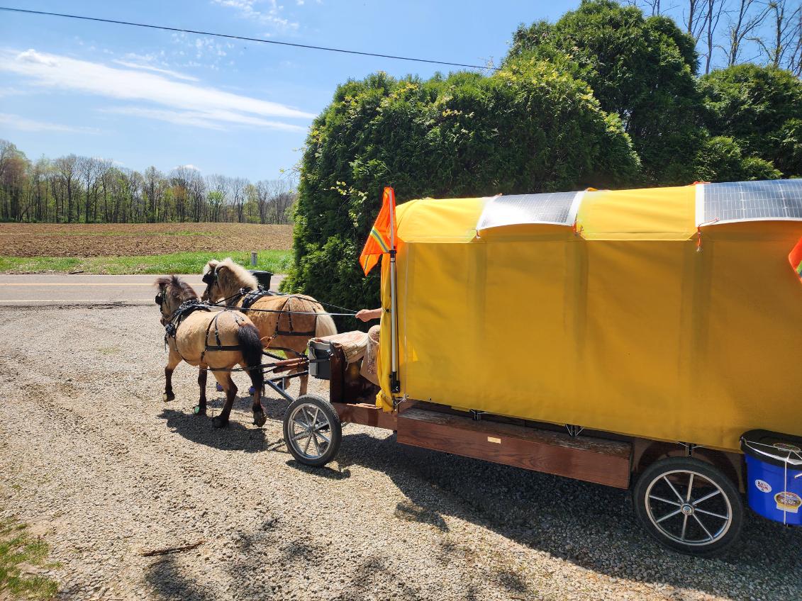 In the morning Christopher, Mayor of Brinkhaven came down for a “Who Is My Neighbor?” interview and then held the ponies as I hitched them up. When I learned to drive teams, back 40+ years ago, I was taught to put the Rock on the left and the Dragon on the right. This morning I decided to swap the ponies to fit that configuration and see how it felt. It felt like they went from pulling kinda far apart to literally bumping bellies, but early days. First adventure of the day was the beautiful Bridge of Dreams – the second longest covered bridge in Ohio – and then half of our 12 mile day on the multi-use trail. A leggy young doe amble-gamboled across the trail ahead of us, chipmunks stood up on the side of the trail to see who was coming, again, I was just blown away by the beauty. I’m coming to a whole new appreciation for Ohio!