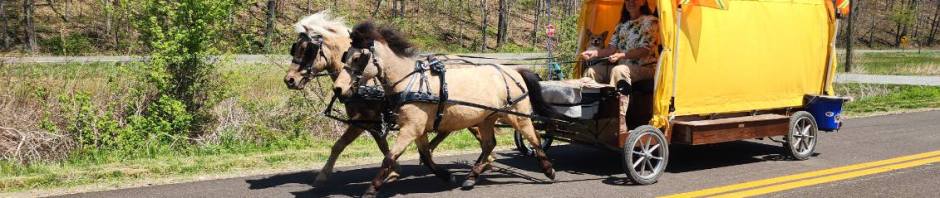I knew there was an underpass towards the end of the day and that the ponies had likely never encountered such a thing. I wasn’t worried, but I was paying attention. As we were approaching it, an Amish buggy pulled by a long-legged bay Standardbred came up behind us. I wasn’t sure of the protocol, but he was Much faster than my boys so I pulled over and stopped, yelling out as he went by “My ponies haven’t been through here before so I’m hoping that your horse can set a good example!” The man waved, the big horse didn’t hesitate, Franklin and Theodore were a little squirrely, but followed right along – and then they decided that they were going to keep up with that long-legged bay and suddenly they were cantering down the road and I had my hands full. I think they recognized the Amish buggy with the orange triangle and figured that there was food and rest in that direction! The turn-off to Brinkhaven was coming right up and I managed to get them slowed down in time to make the turn – whew!