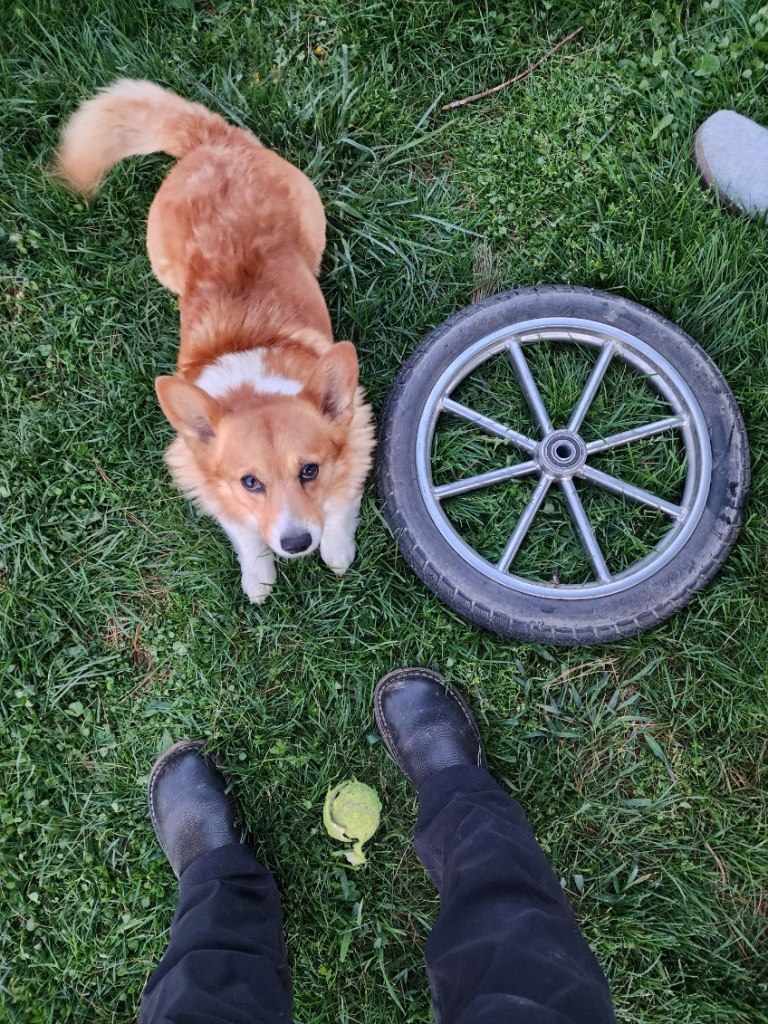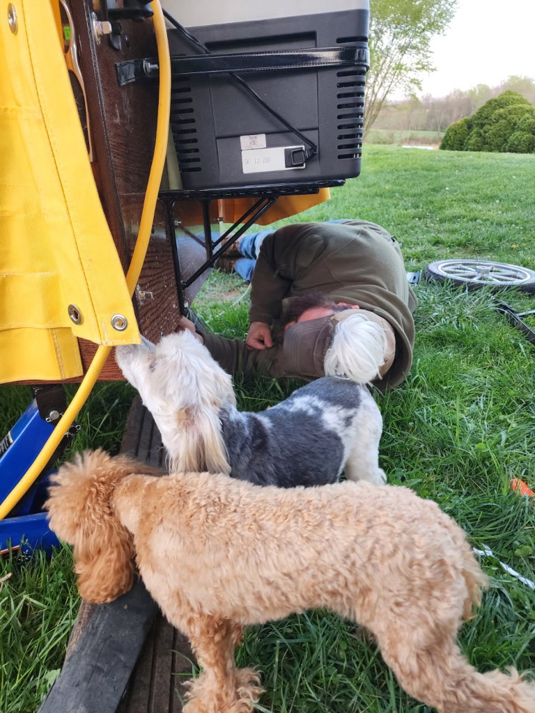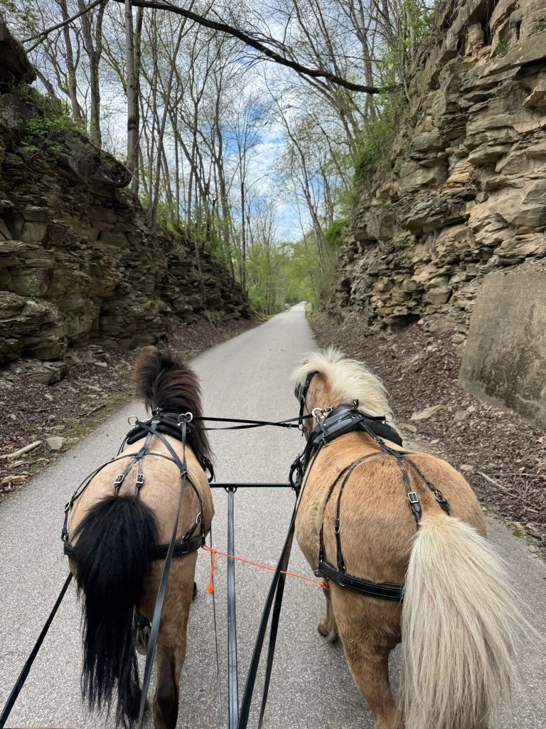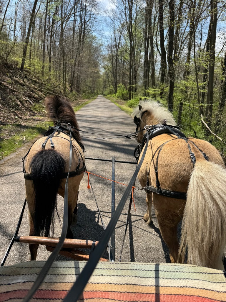 The ponies were spicy after 8 days off, but Wednesday morning we were on the road again, New axle in place (thank you Seth) with some rubber bits inserted between axles and wagon bed for a bit more give. Neighbor Jason (a skilled woodworker) came over and shortened the hip pocket boxes by about 3″ and moved the little rollers back and everything looks good and feels a lot better – minor changes, big results! We had a long mile downhill on gravel (Cavallo hoof boots made the difference there!) and then Laura met us at the bottom of the hill and held the ponies while I took the boots off, because the rest of the day was on the truly lovely Holmes County/Mohican Valley Trail and I don’t want the ponies to lose the ability to go barefoot when the going is smooth.