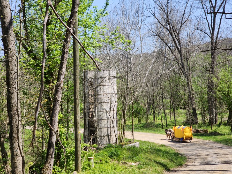 Our goal for the day was 12 miles to the wildlife area/park down by the Mohican River in Brinkhaven which offered a privy, a picnic table pavillion, special permission to spend the night, grass for the ponies to eat and an interview with the Mayor, Christopher! The ponies settled down after the first mile and jogged along in a steady rhythm, the sun was shining, Thick was happy riding shotgun, the turning radius of the Mustard Seed was much improved, the trail was absolutely lovely – I was driving along wishing that there were trails like this across the entire country – bicycles, people walking their dogs, a woman wearing a baby and enjoying the fresh air, the occasional Amish buggy, the trees turning greener by the day as Spring rolled in, flowers and squirrels, tranquil creeks, the ponies seem in accord as they walk for awhile, then pick up their jog again, everything feeling so peaceful and good.